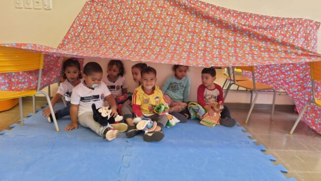 Cabaninha com lençol; cesto do tesouro; brincadeira com fantasia; caça ao tesouro