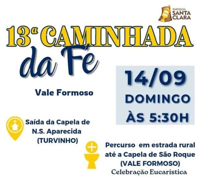 Um dos eventos religiosos de Novo Horizonte que já se tornou uma tradição, é a CAMINHADA DA FÉ e para este ano já tem a sua data. O evento promovido pela Paroquia de santa Clara de Assis correrá no próximo dia 14 de setembro á partir das 5;30 da manhã.