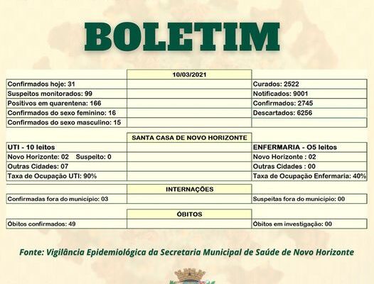 Boletim de hoje Quarta-feira , 10/03, onde 31 pessoas testaram positivo COVID-19, taxa de ocupação da U.T.I 90%, na cidade de Novo Horizonte-SP Quer ficar por dentro das notícias do Brasil e do mundo? Aproveite […]