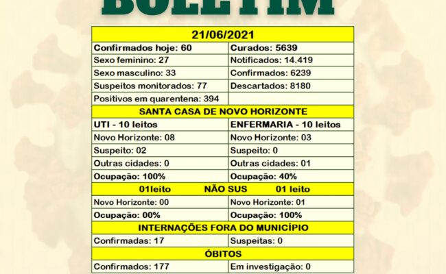 BOLETIM 21/06/2021Óbitos18/06- Homem, 42 anos (Internado no Hospital São Francisco)19/06- Homem, 66 anos (Internado na Santa Casa)20/06- Homens, 30 anos (Internado na Santa Casa) Homem, 79 anos (Internado na Santa Casa) Homem, 90 anos (Internado […]