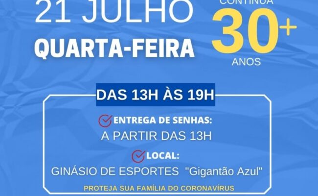 A Prefeitura de Penápolis informa que continua nesta quarta-feira (21/07) a vacinação contra a Covid-19 para pessoas a partir de 30 anos, no Ginásio de Esportes “Prof. Antônio de Castilho Braga”, o Gigantão Azul. A […]