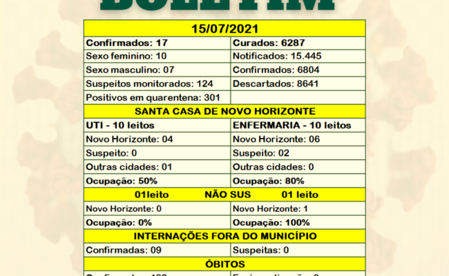 BOLETIM 15/07/2021Óbito11/07- Mulher, 47 anos (internada no Emílio Carlos, faleceu dia 11/07, porém só foi confirmado hoje) Quer ficar por dentro das notícias do Brasil e do mundo? Aproveite a promoção SKY TV por tempo […]