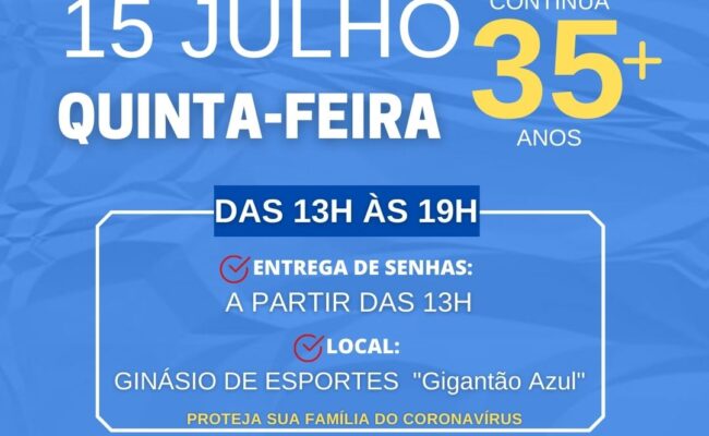 A Prefeitura de Penápolis informa que continua nesta quinta-feira (15/07) a vacinação contra a Covid-19 para pessoas a partir de 35 anos, no Ginásio de Esportes “Prof. Antônio de Castilho Braga”, o Gigantão Azul. A […]