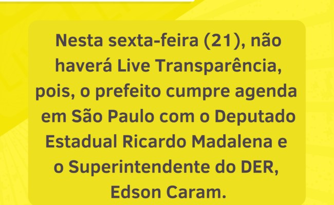 Nesta sexta-feira (21), não haverá Live Transparência, pois, o prefeito cumpre agenda em São Paulo com o Deputado Estadual Ricardo Madalena e o Superintendente do DER, Edson Caram. Quer ficar por dentro das notícias do […]