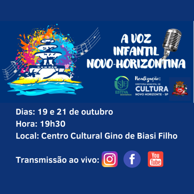 Hoje (19), a partir das 19h30, ocorre o primeiro dia das eliminatórias do concurso A Voz Infantil Novo-horizontina, a fase eliminatória será aberta ao público, a entrada será gratuita, ocorrerá nos dias 19 e 21 de outubro e também será transmitida ao vivo pelo Instagram, Facebook e Youtube.