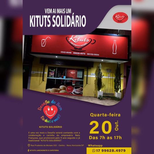 Neste ano o “KITUTS SOLIDÁRIO” acontece HOJE no horário das 7 as 17 horas nos na Kituts na Lanchonete e Cafeteira que se localiza na rua Prudente de Moraes 533,centro.