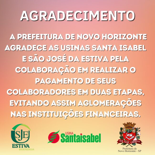 A Prefeitura de Novo Horizonte agradece as Usinas Santa Isabel e São José da Estiva pela colaboração em realizar o pagamento de seus colaboradores em duas etapas, evitando assim aglomerações nas Instituições Financeiras.