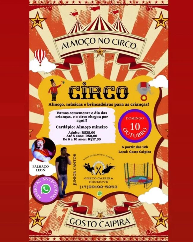 Próximo Domingo 10/10 a partir das 12hs, traga suas crianças para aquele almoço mineiro e muitas brincadeiras e animações em comemoração o dia das crianças!Animação Palhaço Leon e música por conta do Junior Cantor!!!Esperamos vocês no Restaurante Gosto Caipira!#restaurantegostocaipira#circo#diadascrianças
