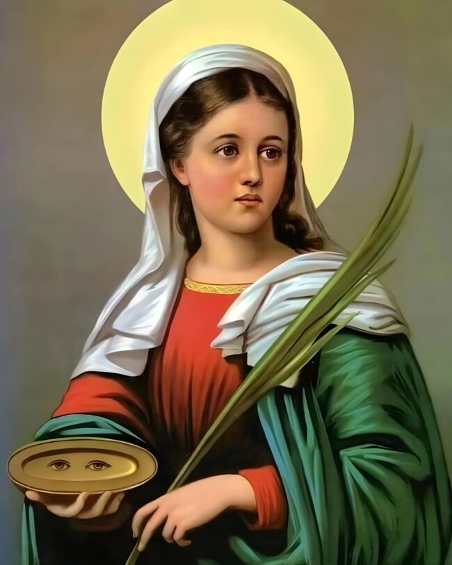 Antes de sua morte teriam arrancado os seus olhos, Santa Luzia é reconhecida pela vida que levou Jesus – Luz do Mundo – até as últimas consequências, pois assim testemunhou diante dos acusadores: “Adoro a um só Deus verdadeiro, e a Ele prometi amor e fidelidade”.