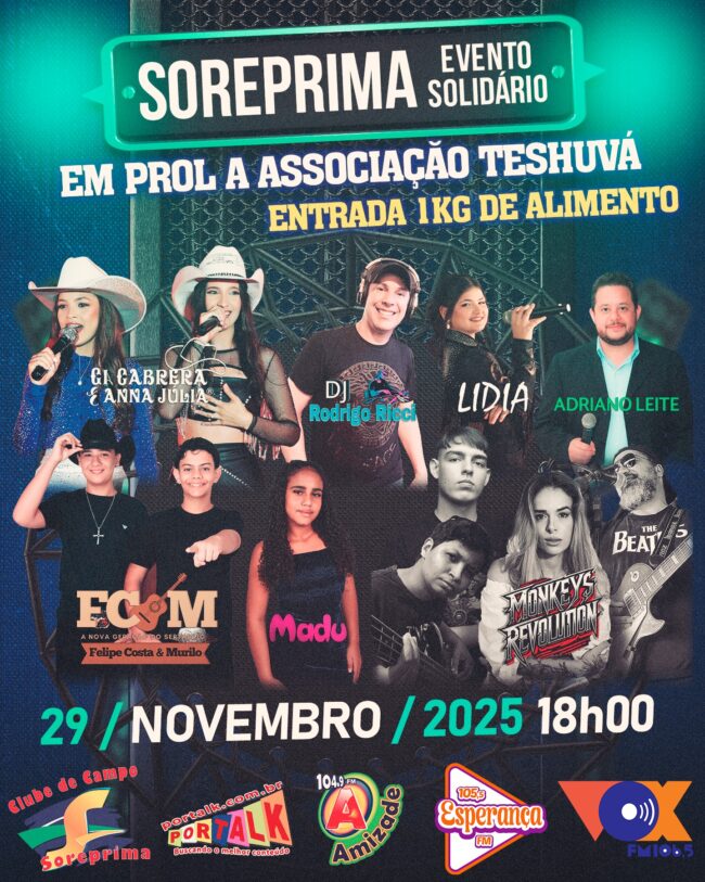O evento Solidário ocorre á partir das 18 horas, no Clube de Campo e com as seguintes atrações já confirmadas: Gi Cabrera & Anna Júlia, DJ Rodrigo Ricci, Lídia, Felipe Costa & Murilo, Madu, Monkeys Revolution e a apresentação do radialista Adriano Leite. Será mais uma celebração de solidariedade, música e união, onde cada contribuição fará a diferença para quem mais precisa. Venha participar, traga sua família e amigos e ajude a transformar vidas. Arte: Divulgação (Alvani)