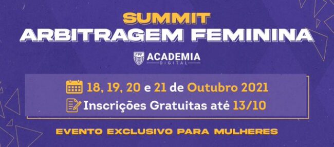 Estão abertas as inscrições para o Summit de Arbitragem Feminina. Um espaço criado para a fomentação e o debate da mulher como árbitra, seus desafios, carreira, a gestão da arbitragem feminina, principais provocações psicológicas, legislação etc.