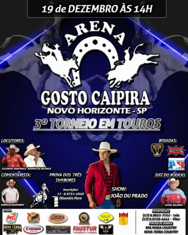 3° TORNEIO EM TOUROS Arena Gosto Caipira – Novo Horizonte-SP.Domingo 19.12 – 14 Hs.Prova dos 3 Tambores – Inscrições 17. 99751-5056 – Elisandra MaraShow