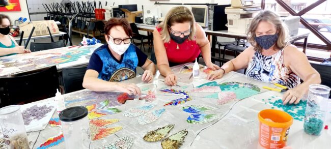 Todo o trabalho é desenvolvido com recursos da Lei Aldir Blanc e a composição é feita na Estação Cultura Deca Ruette. O espaço foi cedido pela Secretaria Municipal de Cultura para a atividade que respeita as regras de distanciamento entre os mosaicistas, além do uso de máscaras. “Estamos muito felizes em poder entregar esse presente para a cidade. Conseguimos a autorização para a instalação no Parque do Aeroporto e está sendo muito prazeroso o nosso encontro. No ano passado, ficamos cada um quietinho em sua casa, só com as aulas online, por conta da pandemia, e agora retomamos os nossos encontros. Viemos trabalhar em grupos de quatro, cinco mosaicistas, cada um em um dia e estamos ansiosos e felizes de poder entregar esse projeto”, finaliza a arte-educadora.