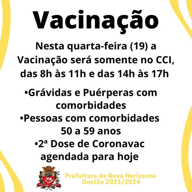 Nesta quarta-feira (19), o Drive-Thru da Igreja Matriz não funcionará.Pessoas agendadas para receber a 2ª Dose da Coronavac podem ir ao CCI