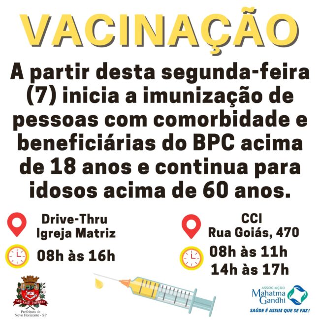 Inicia nesta segunda-feira (7) a imunização para pessoas com comorbidade e beneficiárias do BPC (Benefício de Prestação Continuada), acima de 18 anos. Para idosos acima de 60 anos a vacinação continua e pessoas aptas a receber a segunda dose também pode se dirigir a um dos dois locais para finalizar a imunização. Não deixe de receber a segunda dose. Aproveite a oportunidade de ficar protegido do coronavírus.