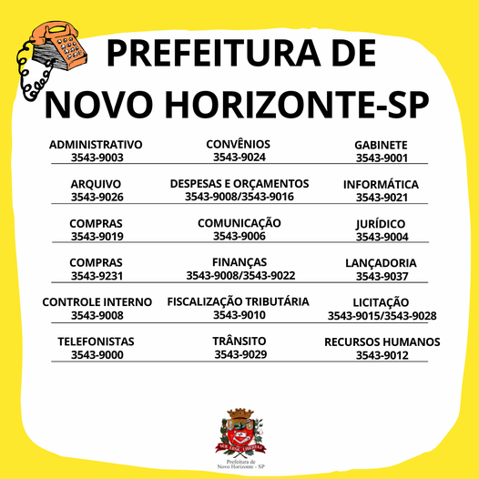 Prefeitura de Novo Horizonte informa os números de telefones para atendimento aos municípes.
