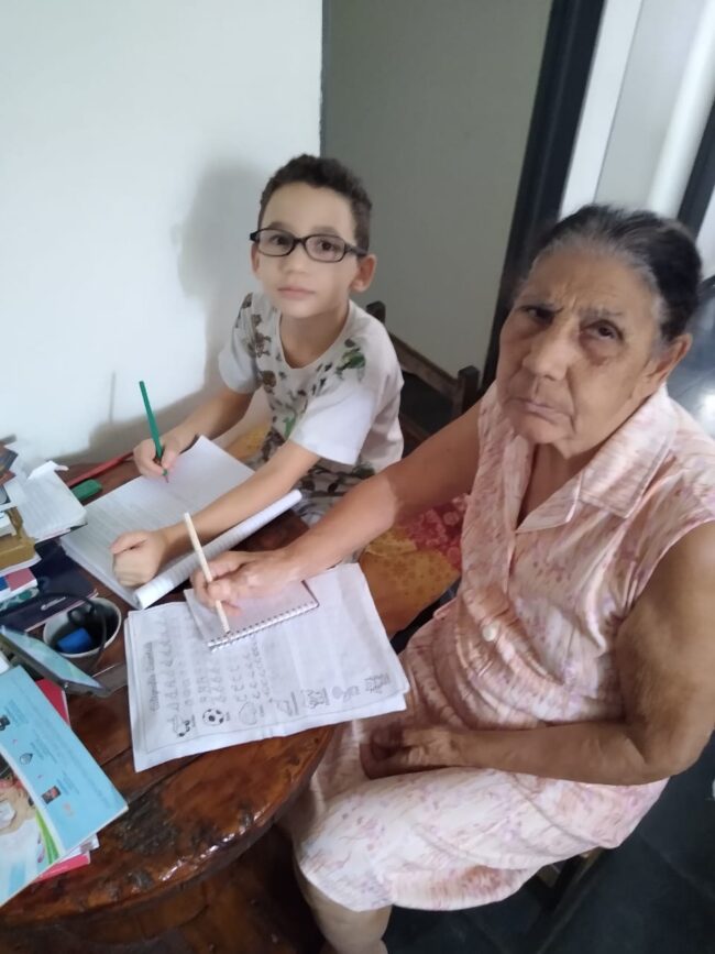 Emoção e superação! As aulas online desenvolvem papel importante para a continuidade da aprendizagem, diante do cenário de pandemia da covid-19, mas na escola Santos Aguiar, elas atingiram um novo patamar. A turma dos alunos do 2º ano do Ensino Fundamental ganhou uma estudante para lá de especial. É a dona Maria José da Silva Crispim, que aos 79 anos, conseguiu ter a oportunidade de aprender e escrever. Ela é tia-avó do Leonardo, de 7 anos e acompanha, há cinco meses, todos os ensinamentos da professora Gabriela Moreira.