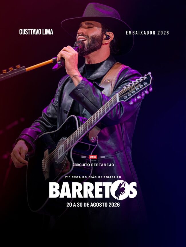 A Festa do Peão de Barretos anunciou o nome do Embaixador de 2026 do rodeio: o cantor Gusttavo Lima. O artista que já leva o apelido do cargo vai representar o evento pela terceira vez na carreira. A 71ª edição irá ocorrer entre os dias 20 e 30 de agosto. A venda geral de ingressos começou ontem.