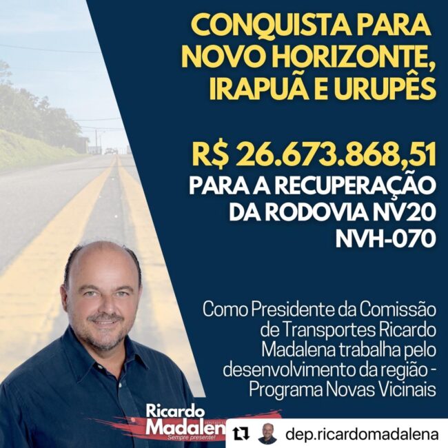 ⠀Como presidente da Comissão de Transportes na Assembleia Legislativa tenho trabalhado pelo desenvolvimento dos municípios e a conquista da recuperação da rodovia NV20 NVH-070 – trecho entre Novo Horizonte, Irapuã e Urupês vai beneficiar toda a região.⠀