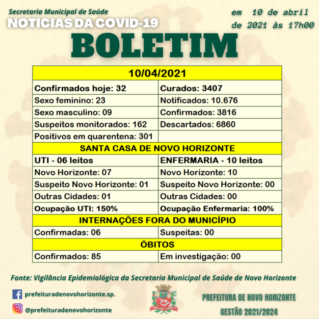 BOLETIM 10/04/2021 Óbitos Mulher – 73 anos Homens – 72 e 86 anos