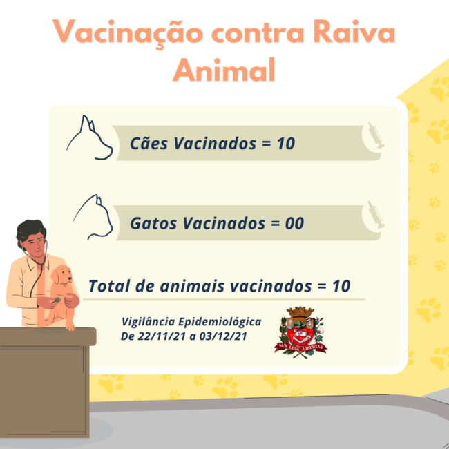 É importante ressaltar que nosso município recebe mensalmente 200 doses de vacina contra raiva animal. Realize o agendamento pelo telefone da vigilância epidemiológica 3542-9926.A procura pela vacinação animal está baixa, portanto, faça o agendamento e não deixe de levar seu pet para ser vacinado.