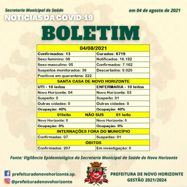 BOLETIM 04/08/2021ÓbitoHomem, 90 anos (internado no Emílio Carlos)