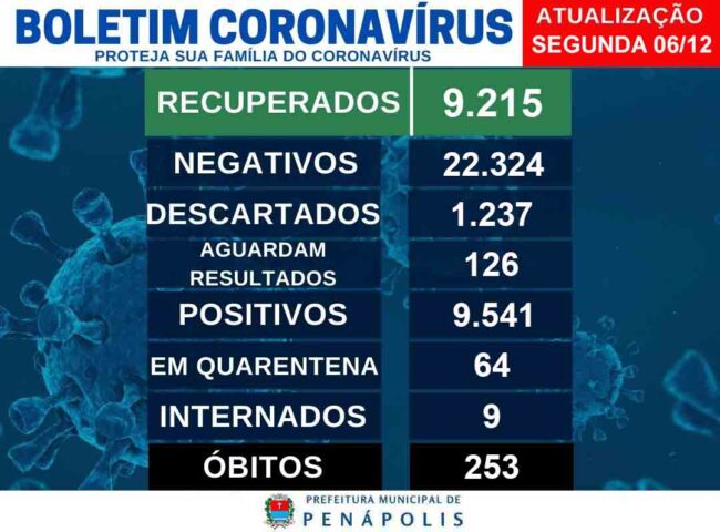 A Secretaria Municipal de Saúde informa que até as 16h desta segunda-feira (06) foram registrados 9.541 casos positivos de Covid-19. Dos casos positivos de Penápolis, nove pacientes estão internados, 64 pessoas estão em quarentena e 9.215 pacientes estão recuperados.