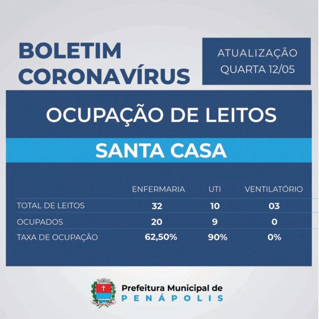 A Santa Casa de Misericórdia de Penápolis informa que até o momento nove, dos 10 leitos existentes da UTI (Unidade de Terapia Intensiva) Covid estão ocupados. Três pacientes são de Penápolis (todos com diagnóstico positivo para Covid-19). Dois pacientes são moradores de Barbosa e um de Valparaíso. Três pacientes internados na ala apresentam outras comorbidades.