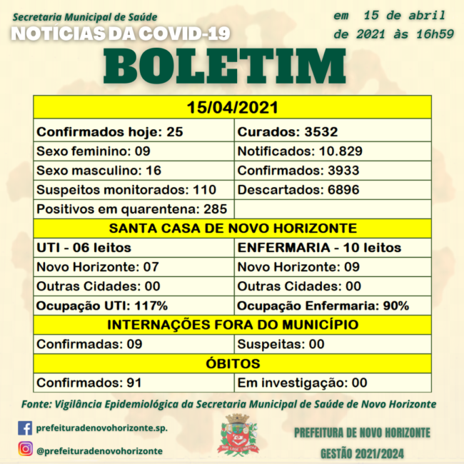𝑩𝑶𝑳𝑬𝑻𝑰𝑴 𝑫𝑨 𝑽𝑰𝑫𝑨 – Novo Horizonte registra mais 2 Óbitos e 25 novos casos e 3.532 recuperados.Resultado de quarta-feira (14), a taxa de ocupação de leitos de UTI continua com 117% e à enfermaria 90% da ocupação total.Óbitos Mulher 64 anos, estava internada em Catanduva, veio a óbito no dia 09-04 a confirmação veio hoje.Homem42 anos