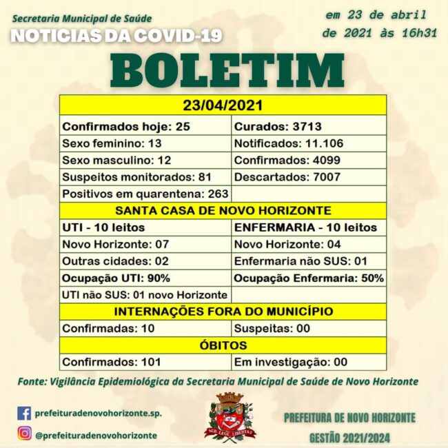 𝑩𝑶𝑳𝑬𝑻𝑰𝑴 𝑫𝑨 𝑽𝑰𝑫𝑨 – Novo Horizonte registra mais um Óbito e 33 novos casos e 3.713 recuperados.Resultado de sexta-feira (23), a taxa de ocupação de leitos de UTI esta com 90% e à enfermaria 50% da ocupação total.Óbito Homens – 52 e 66 anos