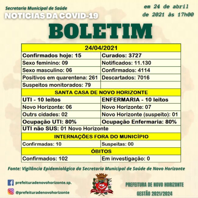 𝑩𝑶𝑳𝑬𝑻𝑰𝑴 𝑫𝑨 𝑽𝑰𝑫𝑨 – Novo Horizonte registra mais um Óbito e 15 novos casos e 3.727 recuperados.Resultado de Sábado (24), a taxa de ocupação de leitos de UTI esta com 80% e à enfermaria 80% da ocupação total.Óbito Homem, 54 anos
