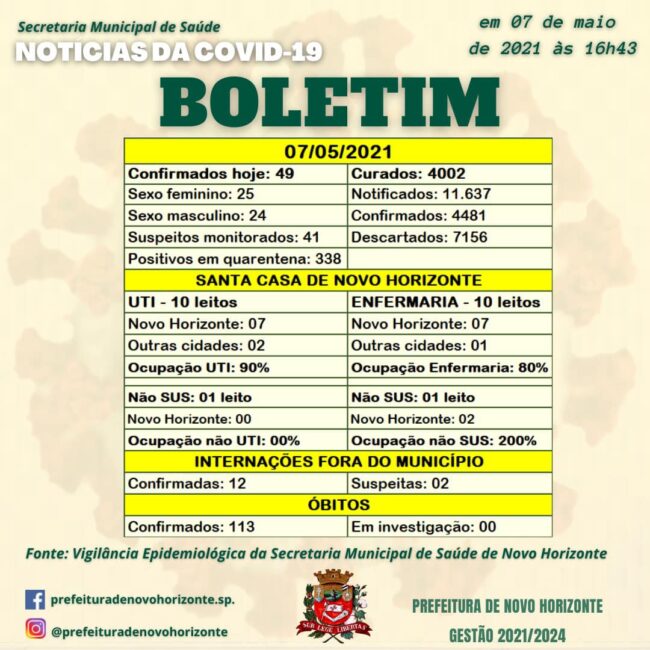 𝑩𝑶𝑳𝑬𝑻𝑰𝑴 𝑫𝑨 𝑽𝑰𝑫𝑨 – Novo Horizonte registra 49 novos casos e 4.002 recuperados.Resultado de hoje Sexta-feira(07), a taxa de ocupação de leitos de UTI esta com 90% e à enfermaria 80% da ocupação total.