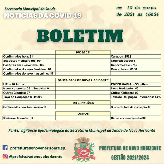 Boletim de hoje Quarta-feira , 10/03, onde 31 pessoas testaram positivo COVID-19, taxa de ocupação da U.T.I 90%, na cidade de Novo Horizonte-SP