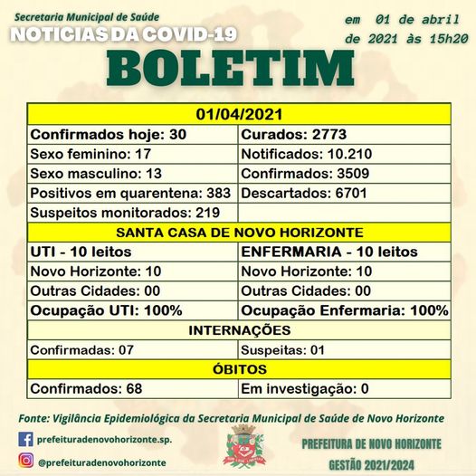 BOLETIM 01/04/2021Óbitos 28/03 – Mulher, 82 anos (resultado chegou hoje)31/03 – Mulher, 86 anos01/04 – Homem, 52 anos