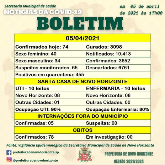 𝑩𝑶𝑳𝑬𝑻𝑰𝑴 𝑫𝑨 𝑽𝑰𝑫𝑨 – Novo Horizonte registra mais 7 óbitos e 74 novos casos e 3.098 recuperados.Resultado de Domingo e de hoje Segunda-feira(05), a taxa de ocupação de leitos de UTI continua com 90% e à enfermaria 80% da ocupação total.BOLETIM 05/04/2021ÓbitosHomens – 60 e 73 anosMulheres – 39, 51, 62, 81 e 89 anos