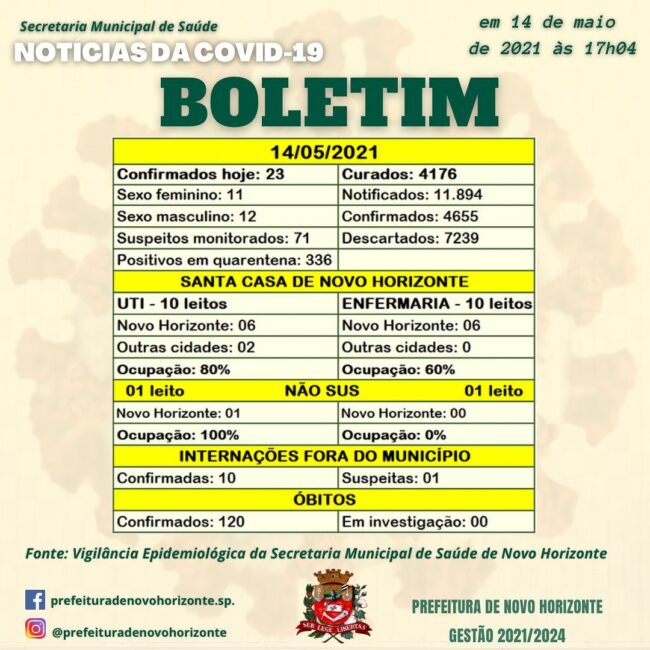 BOLETIM 14/05/2021ÓbitosMulheres – 48 e 83 anos Homens – 48 e 54 anosMulher – 37 anos (13/05)