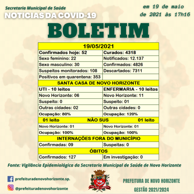 BOLETIM 19/05/2021ÓbitosMulher, 89 anos Homem, 72 anos (Faleceu em Catanduva no dia 17/05 – Declaração de Óbito chegou hoje)