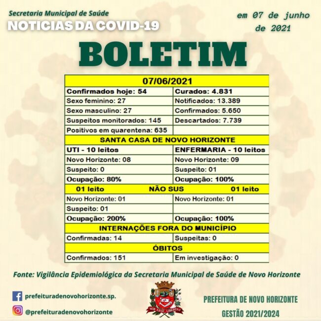 BOLETIM 07/06/2021Óbito 05/06 – Mulher, 59 anos (Internada Santa Casa)