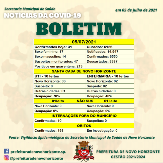 BOLETIM COVID 19 NOVO HORIZONTE SP