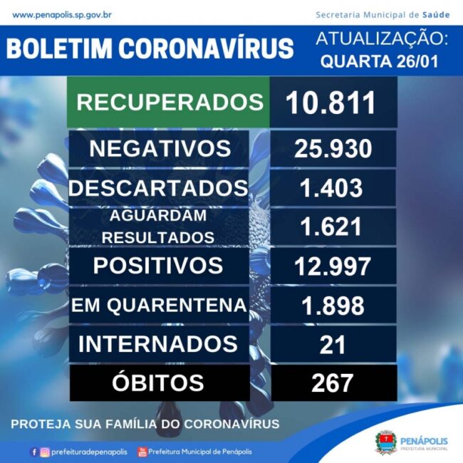 A Secretaria Municipal de Saúde informa que até esta quarta-feira (26) foram registrados 12.997 casos positivos de Covid-19. Dos casos positivos de Penápolis, 21 pacientes estão internados, 1.898 pessoas estão em quarentena e 10.811 pacientes estão recuperados.