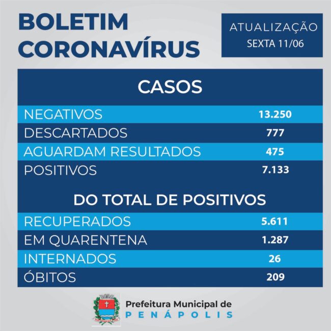 A Secretaria Municipal de Saúde informa que até às 16h desta sexta-feira (11), foram registrados 7.133 casos positivos de Covid-19. Dos casos positivos de Penápolis, 26 pacientes estão internados, 1.287 pessoas estão em quarentena e 5.611 pacientes estão recuperados.