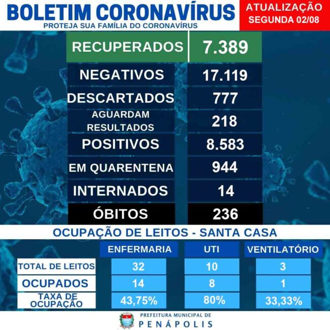 Até o momento, foram registrados 236 óbitos por Covid-19 (133 homens e 103 mulheres). O Serviço de Vigilância Epidemiológica confirmou o óbito de uma homem, 43 anos, ocorrido no dia 29 de julho.