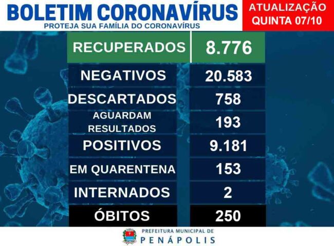 Positivos A Secretaria Municipal de Saúde informa que até as 16h desta quinta-feira (07), foram registrados 9.181 casos positivos de Covid-19. Dos casos positivos de Penápolis, dois pacientes estão internados, 153 pessoas estão em quarentena e 8.776 pacientes estão recuperados. Óbitos Até o momento, foram registrados 250 óbitos por Covid-19 (143 homens e 107 mulheres). Suspeitos e descartados Até o fechamento deste boletim, 193 pacientes aguardam o resultado de exame ou a data para a realização do teste rápido. Outros 758 casos foram descartados por avaliação clínico-epidemiológica e 20.583 pacientes tiveram resultado negativo para Covid-19. Este boletim inclui os dados de todos os pacientes notificados por síndrome gripal. Ocupação Santa Casa A Santa Casa de Misericórdia de Penápolis informa que até o momento: UTI Covid: seis dos dez leitos existentes da UTI Covid estão ocupados. Um paciente, morador de Penápolis, é positivo para Covid-19. – Os outros cinco pacientes internados apresentam outras comorbidades. UTI Geral: não há pacientes de Covid internados na ala. – Dos dez leitos, seis estão ocupados por pacientes que apresentam outras comorbidades. Suporte Ventilatório: os três leitos de suporte ventilatório estão disponíveis. Não há pacientes internados no setor. Enfermaria Covid: dos 32 leitos disponíveis, três estão ocupados. Dois pacientes são moradores de Penápolis, um positivo para Covid-19 e um suspeito, aguardando resultado de exame. Um paciente é morador de Avanhandava, positivo para Covid19. Enfermaria Geral – Ala B: não há pacientes de Covid internados na ala. Secom – PMP