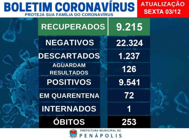 A Secretaria Municipal de Saúde informa que até as 16h desta sexta-feira (03) foram registrados 9.541 casos positivos de Covid-19. Dos casos positivos de Penápolis, um paciente está internado, 72 pessoas estão em quarentena e 9.215 pacientes estão recuperados.
