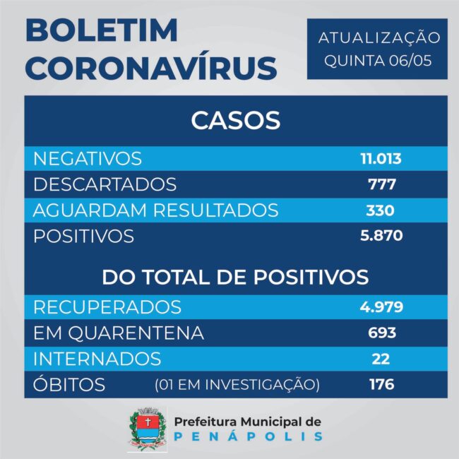 A Secretaria Municipal de Saúde informa que até às 17h desta quinta-feira (06), foram registrados 5.870 casos positivos de Covid-19. Dos casos positivos de Penápolis, 22 pacientes estão internados, 693 pessoas estão em quarentena e 4.979 pacientes estão recuperados.