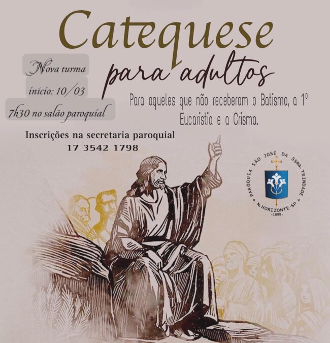 A Paroquia de São José da Santíssima Trindade esta com as inscrições abertas aos adultos que desejam participar da Catequese. As aulas tem inicio no próximo dia 10 de março as 7:30 horas no salão Paroquial. Inscrições e informações na Secretaria Paroquial pelo fone 17-3542-1798. (Alvani)