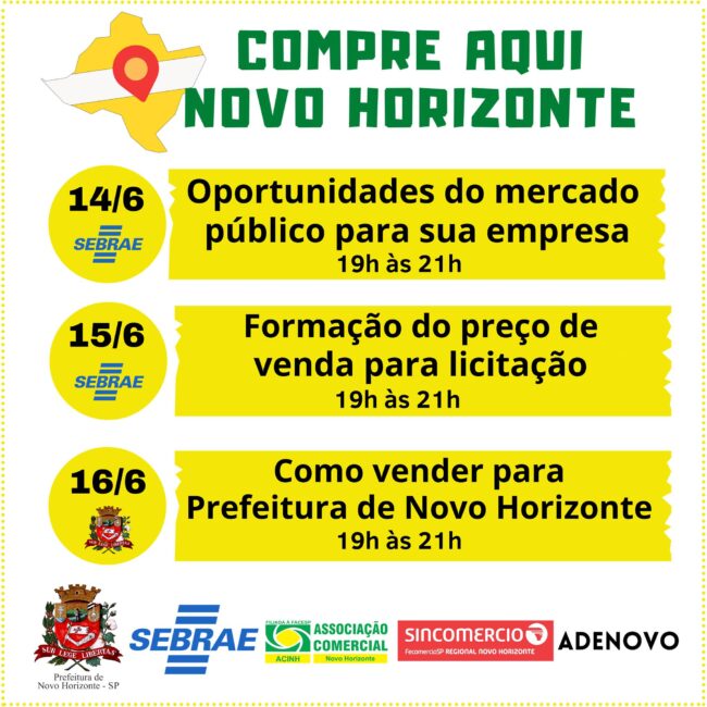A Prefeitura de Novo Horizonte, através da Diretoria de Desenvolvimento Econômico, em parceria com o Sebrae e Associação Comercial iniciam neste mês no município o Projeto Compre Aqui Novo Horizonte. A capacitação em compras públicas para MEI, Micro e Pequenas Empresas tem como objetivo orientar os empresários sobre as oportunidades de vender para o governo, dos aspectos legais que beneficiam as pequenas empresas, como formar corretamente o preço de venda e calcular a margem de negociação, e por fim, conhecer o processo de compras públicas adotado pela Prefeitura de Novo Horizonte. O Programa é composto por 3 encontros coletivos, online e ao vivo, de 2 horas cada mais 2 horas de consultoria individu-al por empresa participante, que serão agendadas após os encontros coletivos com cada empresário participante. Faça sua inscrição no Compre Aqui até sexta-feira (11): http://bit.ly/CompreAquiNovoHorizonteLarissa CorrêaDiretoria de Comunicação PMN