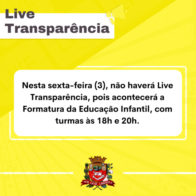 · Comunicado!!!Nesta sexta-feira (3), não haverá Live Transparência, pois acontecerá a Formatura da Educação Infantil, com turmas às 18h e 20h.