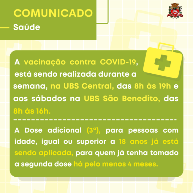 A Prefeitura de Novo Horizonte, através da Secretaria de Saúde, informa que a vacinação contra COVID 19, durante a semana, está sendo realizada apenas na UBS central, das 8h às 19h, para garantir o melhor controle das doses remanescentes e estoque, pois após a abertura do frasco, a mesma só pode ser utilizada dentro do período de 6h, e aos sábados a vacinação permanece na UBS São Benedito das 8h às 16h. As dozes adicionais (3ª) já estão sendo aplicadas, para quem já tenha tomado a segunda dose há pelo menos 4 meses.