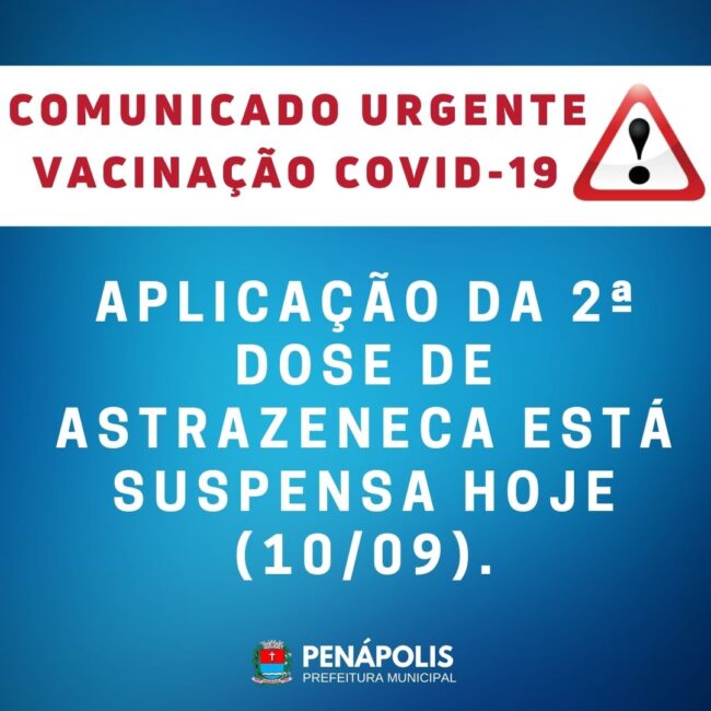 A Secretaria Municipal de Saúde informa que hoje (10/09), está suspensa a aplicação da 2ª dose da vacina Astrazêneca para as pessoas que estavam agendadas. Houve um atraso na entrega da nova grade de vacinas para os municípios e por isso, Penápolis não possui doses da Astrazêneca para manter a vacinação desse público.